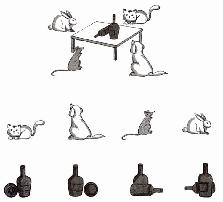 猫连第三幅图(瓶在左,横瓶在右且瓶口朝右);狗连第二幅图(瓶在左,圆在右);老鼠连第一幅图(圆在左,瓶在右);兔子连第四幅图(横瓶在左,瓶口朝左,瓶在右)。