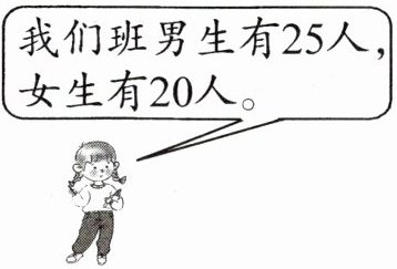 (1)已知男生有$25$人,女生有$20$人,求全班人数,就是把男生人数和女生人数合起来,用加法计算,即$25 + 20 = 45$(人)。
