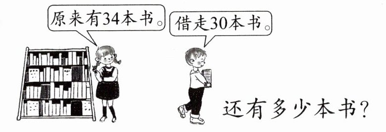 【解析】:用原来有的书的数量减去借走的书的数量,就是剩下的书的数量,即$34 - 30$。