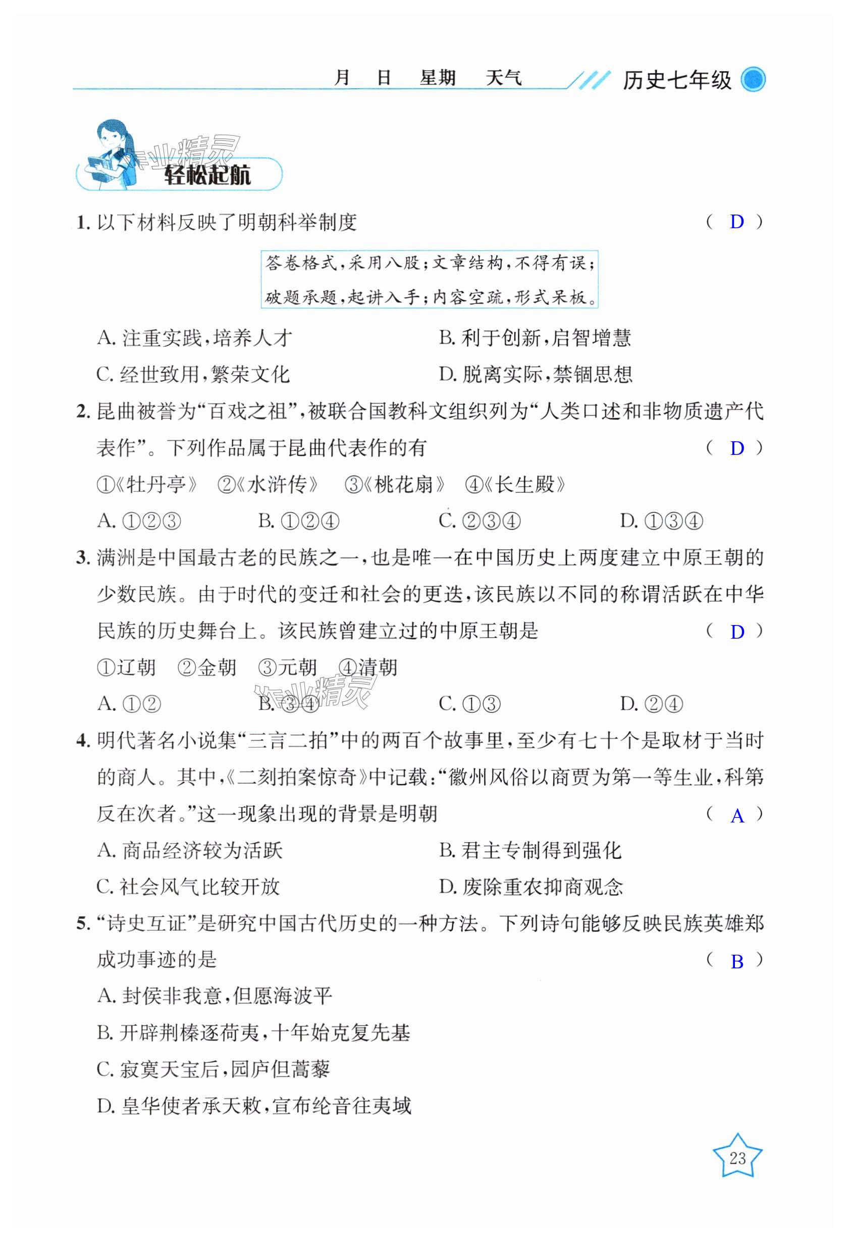 注:目前有些书本章节名称可能整理的还不是很完善,但都是按照顺序排列的,请同学们按照顺序仔细查找。练习册 2025年开心假期暑假作业七年级历史武汉出版社 答案主要是用来给同学们做完题方便对答案用的,请勿直接抄袭。