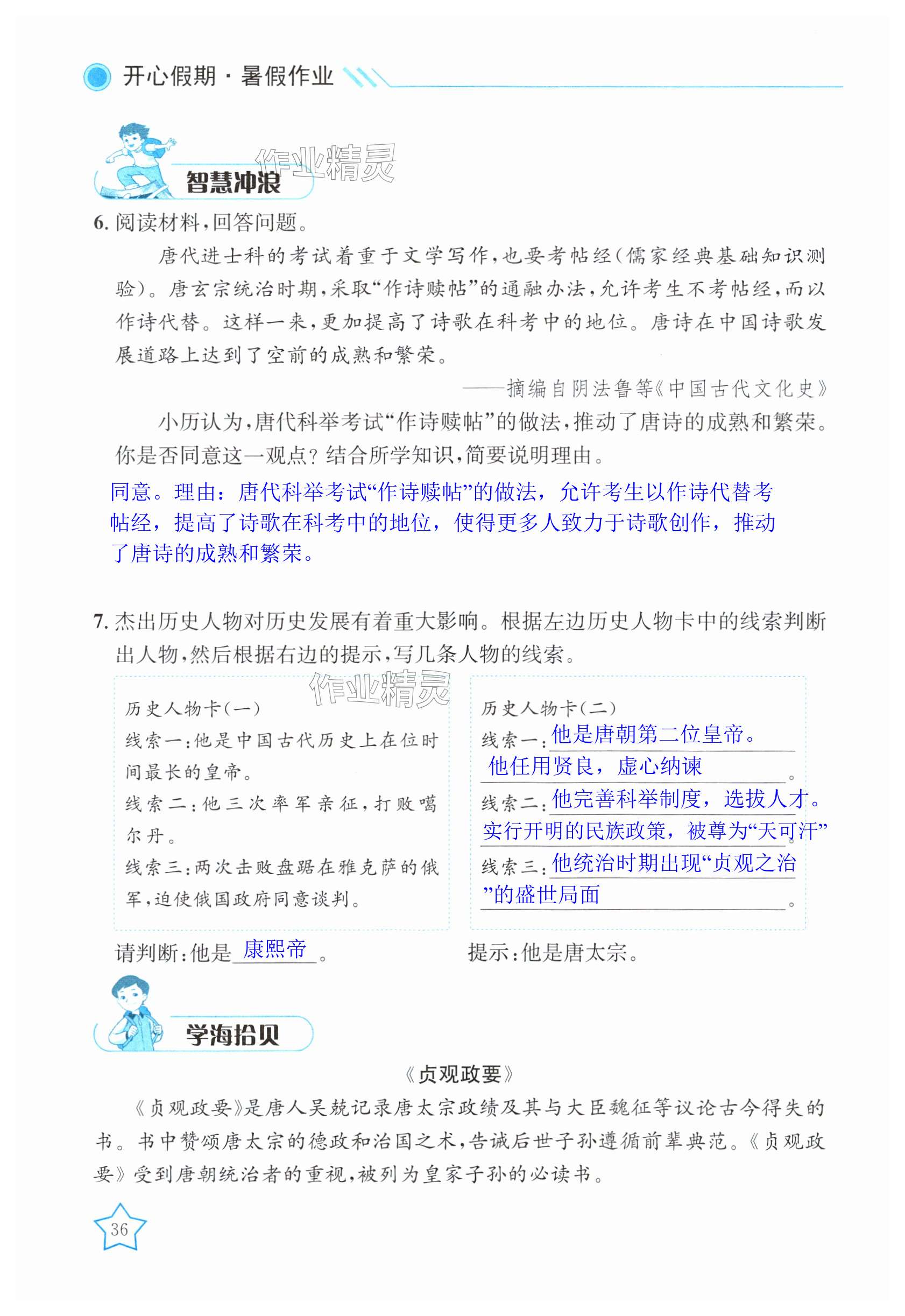 注:目前有些书本章节名称可能整理的还不是很完善,但都是按照顺序排列的,请同学们按照顺序仔细查找。练习册 2025年开心假期暑假作业七年级历史武汉出版社 答案主要是用来给同学们做完题方便对答案用的,请勿直接抄袭。