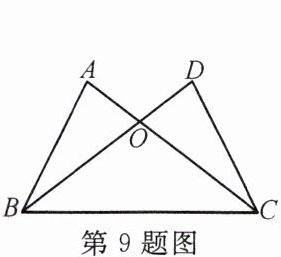 9. 如图,已知$AB = CD$,$AC = DB$,$\angle ABD= 25^{\circ}$,$\angle AOB = 82^{\circ}$,则$\angle DCB= $______