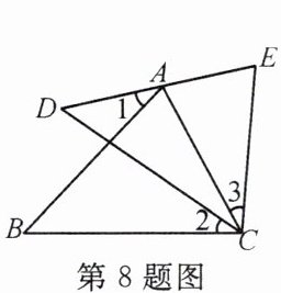 8. 如图,点$A在DE$上,$AC = CE$,$\angle 1= \angle 2= \angle 3$,则$DE$的长等于(