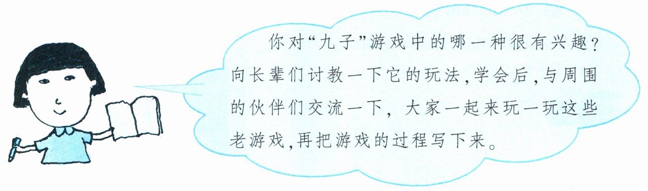 你对“九子”游戏中的哪一种很有兴趣?向长辈们讨教一下它的玩法,学会后,与周围的伙伴们交流一下,大家一起来玩一玩这些老游戏,再把游戏的过程写下来。