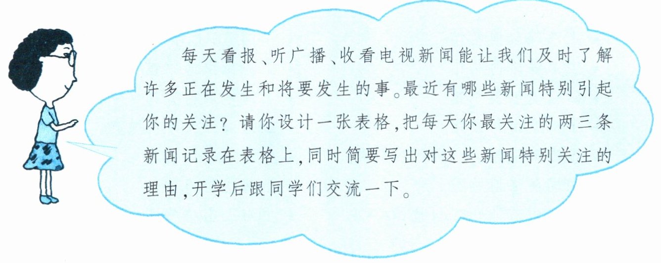 每天看报、听广播、收看电视新闻能让我们及时了解许多正在发生和将要发生的事。最近有哪些新闻特别引起你的关注?请你设计一张表格,把每天你最关注的两三条新闻记录在表格上,同时简要写出对这些新闻特别关注的理由,开学后跟同学们交流一下。