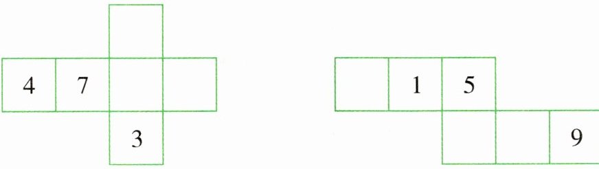 五、下图是一个正方体纸盒的两个展开图,请在各个面上填上适当的数字,使相对两个面的数字之和均为12。
