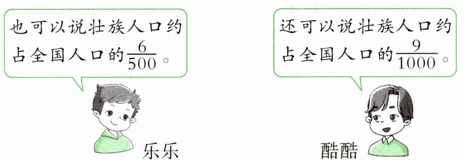 2. 我国有 56 个民族,各民族都有自己独特的民族文化。其中壮族是我国人口最多的少数民族,壮族人口约占全国人口的$\frac {3}{250}$。下面乐乐和酷酷的说法对吗?为什么?