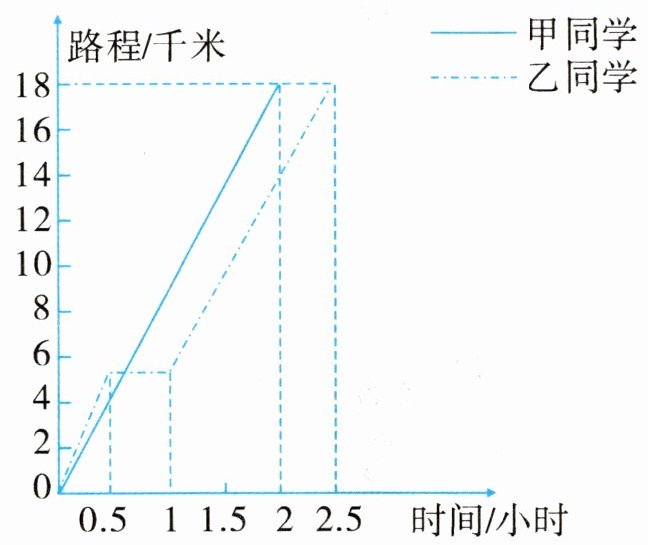 四、下面是甲、乙两位同学从A地出发,骑自行车在同一条路上行驶到B地的折线统计图。请根据统计图回答问题。