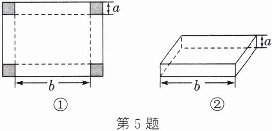5. 新情境 日常生活 如图①,将一张长方形纸板四角各切去一个同样的正方形,制成如图②所示的无盖纸盒,若该纸盒的容积为$4a^{2}b$,则图②中纸盒底部长方形的周长为( )