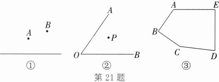21. (12分)(1) 如图①,直线同侧有点A,B,在直线上求作一点C,使它到A,B两点的距离之和最小(保留作图痕迹,不需要写作法).