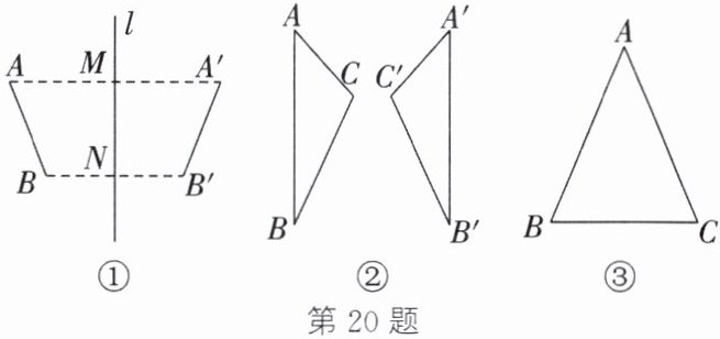 20. (9分)我们知道:成轴对称的两个图形中,对称点的连线被对称轴垂直平分.如图①,AB与$A'B'$关于直线l对称,则$l⊥AA'$于点M,$l⊥BB'$于点N,$AM= A'M,BN= B'N$.