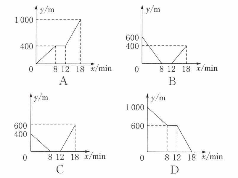 5. ★吴老师家、公园、学校依次在同一条直线上,吴老师家到公园、公园到学校的距离分别为400m,600m.他从家出发匀速步行8min到公园后,停留4min,然后匀速步行6min到学校.设吴老师离公园的距离为ym,所用时间为xmin,则下列表示y与x之间关系的图象中,正确的是( )