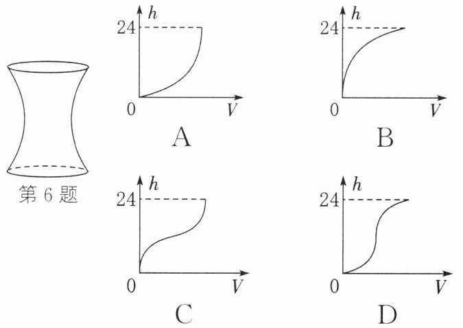 6. 如图所示为一个高为24的容器,现向容器匀速注水,下列图象中能大致反映容器中水的深度(h)与注水量(V)关系的是( )