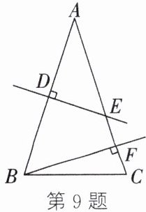 9. 如图,在$△ABC$中,$AB = AC$,AB的垂直平分线DE交AC于点E,CE的垂直平分线正好经过点B,与AC相交于点F,则$∠A$的度数是( )