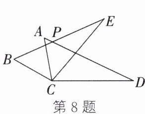 8. 如图,在$△ACD和△BCE$中,$CA = CB$,$AD = BE$,$CD = CE$,$∠ACE = 50°$,$∠BCD = 150°$,AD与BE相交于点P,则$∠BPD$的度数为( )