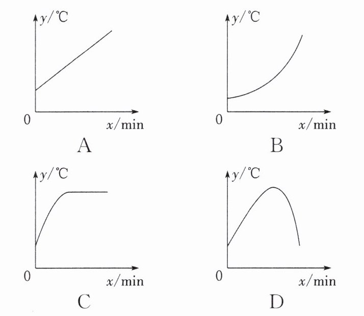 6.(江西中考)将常温中的温度计插入一杯$60℃$的热水(恒温)中,温度计的读数$y(℃)与时间x(min)$的关系用图象可近似表示为( )