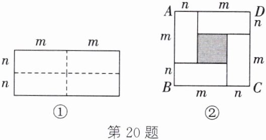 20. (13分)如图①所示为一个长为2m、宽为2n的长方形,沿图中虚线用剪刀均分成四个小长方形,然后按图②所示的方式拼成正方形ABCD.