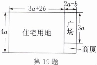 19. (12分)新情境 日常生活 如图(单位:米),某市有一块长方形地用来建造住宅、广场和商厦. 住宅用地是长为$(3a+2b)$米、宽为4a米的长方形,广场是长为3a米、宽为$(2a-b)$米的长方形.