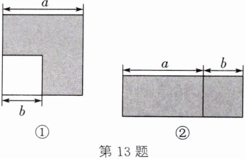 13. 如图①,边长为$a的大正方形中有一个边长为b$的小正方形,图②是由图①中的涂色部分剪拼成的一个长方形。设图①中涂色部分的面积为$S_{1}$,图②中涂色部分的面积为$S_{2}$,则$S_{1}= $______,$S_{2}= $______。写出利用图形的面积关系所得到的公式:______(用含$a$,$b$的代数式表示)。