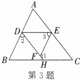 3. 如图,$\angle 1+\angle 2= 180^{\circ}$,$\angle 3= \angle B= 65^{\circ}$,$\angle C= 52^{\circ}$,则$\angle FEC$的度数为______.