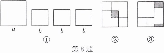8. 如图①,现有一张边长为 $ a $ 的大正方形卡片和三张边长为 $ b \left( \frac { 1 } { 2 } a < b < a \right) $ 的小正方形卡片,取出两张小正方形卡片放入大正方形卡片内,拼成如图②所示的图案,再重新用三张小正方形卡片放入大正方形卡片内拼成如图③所示的图案. 若图③中的涂色部分的面积比图②中的涂色部分的面积大 $ 2 a b - 15 $,则小正方形卡片的面积是( )