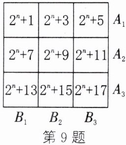 9. 如图,小明在 $ 3 × 3 $ 的方格纸上写了九个式子(其中的 $ n $ 是正整数),每行的三个式子的和自上而下分别记为 $ A _ { 1 } $,$ A _ { 2 } $,$ A _ { 3 } $,每列的三个式子的和自左至右分别记为 $ B _ { 1 } $,$ B _ { 2 } $,$ B _ { 3 } $,其中,值可以等于 789 的是( )