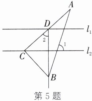 5. 如图,直线 $ l _ { 1 } // l _ { 2 } $,含有 $ 30 ^ { \circ } $ 角的直角三角尺的一个顶点 $ C $ 落在 $ l _ { 2 } $ 上,直角边交 $ l _ { 1 } $ 于点 $ D $,连接 $ B D $,使得 $ B D \perp l _ { 2 } $,若 $ \angle 1 = 72 ^ { \circ } $,则 $ \angle 2 $ 的度数是( )