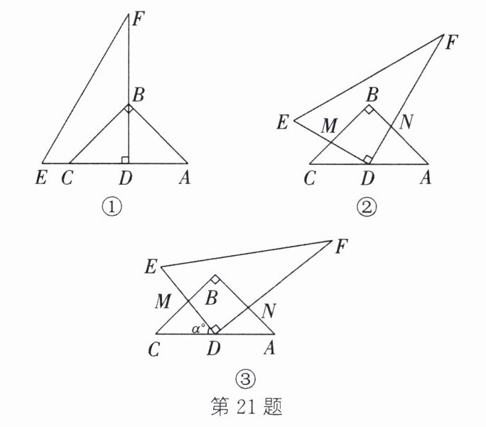 21. (12 分)如图①,在 $ \mathrm { Rt } \triangle A B C $ 中,$ A B = B C $,$ A C = 2 $,将一块含 $ 30 ^ { \circ } $ 角的直角三角尺 $ D E F $ 的直角顶点 $ D $ 放在 $ A C $ 的中点上(直角三角尺的短直角边为 $ D E $,长直角边为 $ D F $),点 $ C $ 在 $ D E $ 上,点 $ B $ 在 $ D F $ 上.