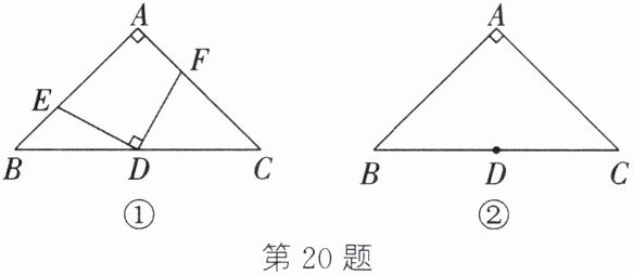 (1)如图①,若 $ E $,$ F $ 分别为 $ A B $,$ A C $ 上的点,且 $ D E \perp D F $,则 $ B E $ 与 $ A F $ 相等吗?为什么?