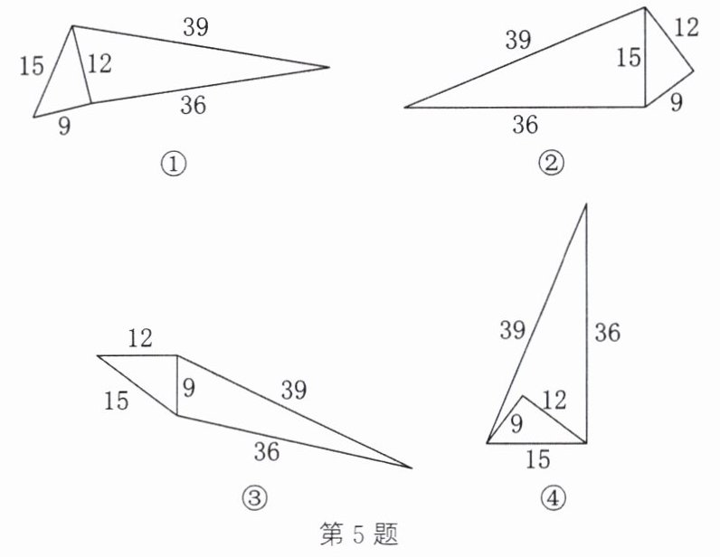 5. (教材P14随堂练习第1题变式)五根小木棒的长度分别为9,12,15,36,39,现将它们摆成两个直角三角形(如图),其中正确的是____(填序号)。