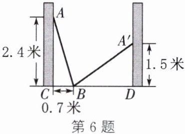 6. 如图,小巷左右两侧是竖直的墙,一架梯子斜靠在左墙时,梯子底端到左墙角的距离BC为0.7米,梯子顶端到地面的距离AC为2.4米,如果保持梯子底端位置不动,将梯子斜靠在右墙时,梯子顶端到地面的距离A'D为1.5米,那么小巷的宽为____米。