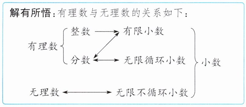 有理数$\left\{\begin{array}{l}\text{整数}\to \text{有限小数}\\ \text{分数}\leftrightarrow \text{无限循环小数}\end{array} \right\}$小数