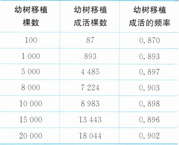 由表格中的数据可知,随着移植棵数的增加,幼树移植成活的频率逐渐稳定在$0.9$左右,