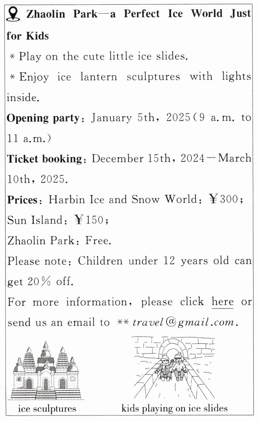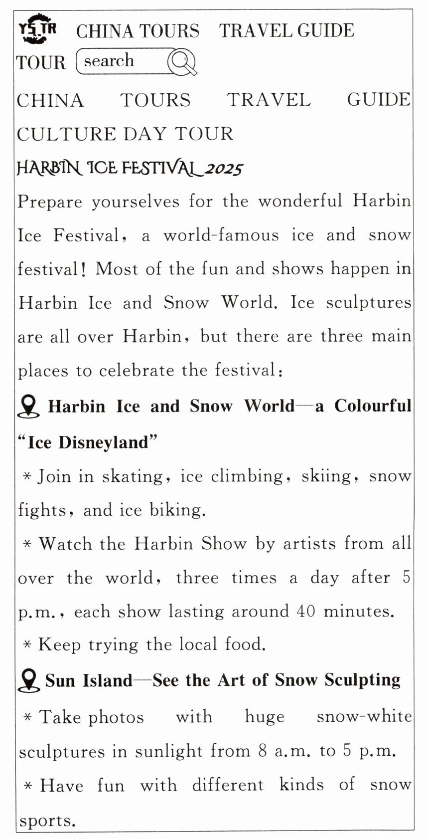 A. Cook some local food. B. Act at the Harbin Show. C. Try different snow sports. D. Take snow sculptures home.