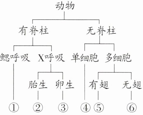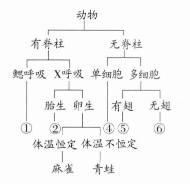 (4) 再给你一种动物——青蛙,请按照上表所示的分类方法,在表中增加一个分类依据,并依此分类依据对青蛙和麻雀进行分类。(要求:在题图的分类表中合适的位置上,仿照表中的画线方法添上相应的线条,并添写上“麻雀”“青蛙”及你增加的分类依据,完成对麻雀和青蛙的分类)