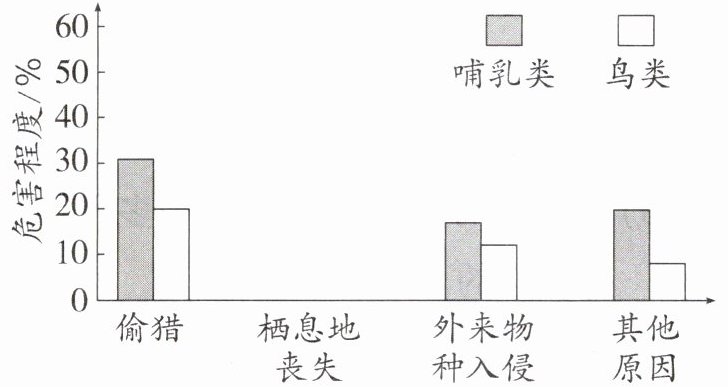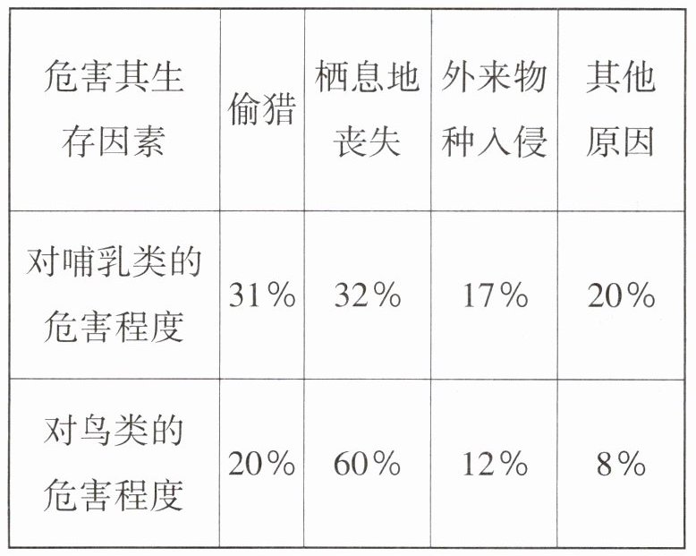 材料二:下面是某动物协会对危害哺乳类和鸟类生存因素的调查数据。