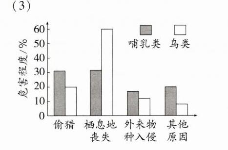 (3) 将材料二表中的数据转换成直方图(如图),请补充完成“栖息地丧失”一栏内容。