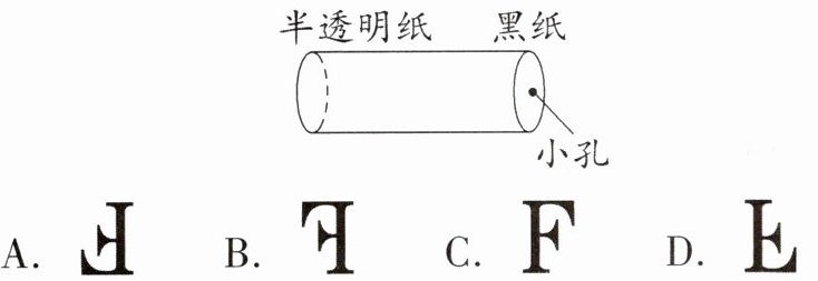2. 小科自制了一个小孔成像演示仪,如图所示,小科将有黑纸的一端正对着竖直放置的“F”形状光源,则他在半透明纸上观察到的像的形状是()