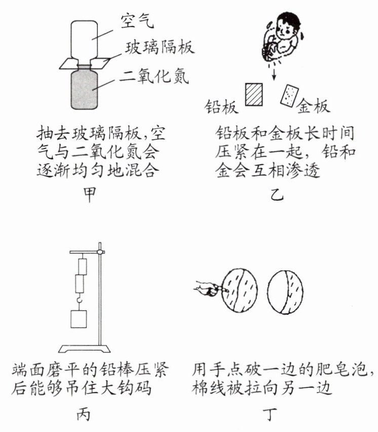 10. 如图所示的四个实验中,可以说明分子之间存在相互作用力的是图______,能说明分子在不断运动的是图______。
