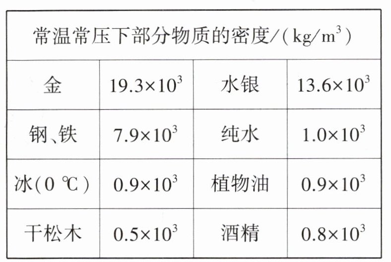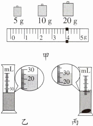 C 解析:由图甲知,金属块的质量 $ m = 20\ \text{g} + 10\ \text{g} + 5\ \text{g} + 4\ \text{g} = 39\ \text{g} $,故 A 错误;由图乙知,水的体积为 $ 25\ \text{cm}^3 $,由图丙知,水和金属块的总体积为 $ 30\ \text{cm}^3 $,则金属块的体积为 $ V = 30\ \text{cm}^3 - 25\ \text{cm}^3 = 5\ \text{cm}^3 $,故 B 错误;金属块的密度: $ \rho = \frac{m}{V} = \frac{39\ \text{g}}{5\ \text{cm}^3} = 7.8\ \text{g/cm}^3 = 7.8 × 10^3\ \text{kg/m}^3 $,故 C 正确,D 错误。