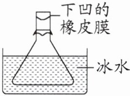 11. 夏天,用橡皮膜封闭一锥形瓶的瓶口,把锥形瓶放在冰水中后,瓶口的橡皮膜会向下凹,如图所示。由此可知:该瓶内气体温度降低,密度______(填“变大”“不变”或“变小”)。根据气体密度的这种变化规律,发生火灾时为了避免吸入燃烧后产生的有毒气体,人应尽量贴近地面爬行的理由是______。