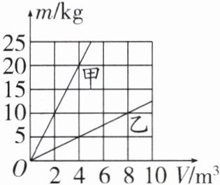 C 解析:图像的横轴表示体积,纵轴表示质量,由图可知,若甲、乙的质量相等,则甲的体积较小,故 A 错误;由图可知,若甲、乙的体积相等,则甲的质量较大,故 B 错误;由图可知,当 $ m_{\text{甲}} = 20\ \text{kg} $ 时, $ V_{\text{甲}} = 4\ \text{m}^3 $,当 $ m_{\text{乙}} = 10\ \text{kg} $ 时, $ V_{\text{乙}} = 8\ \text{m}^3 $,则甲、乙的密度分别为 $ \rho_{\text{甲}} = \frac{m_{\text{甲}}}{V_{\text{甲}}} = \frac{20\ \text{kg}}{4\ \text{m}^3} = 5\ \text{kg/m}^3 $; $ \rho_{\text{乙}} = \frac{m_{\text{乙}}}{V_{\text{乙}}} = \frac{10\ \text{kg}}{8\ \text{m}^3} = 1.25\ \text{kg/m}^3 $,所以,甲、乙的密度之比: $ \rho_{\text{甲}} : \rho_{\text{乙}} = 4 : 1 $,故 C 正确,D 错误。