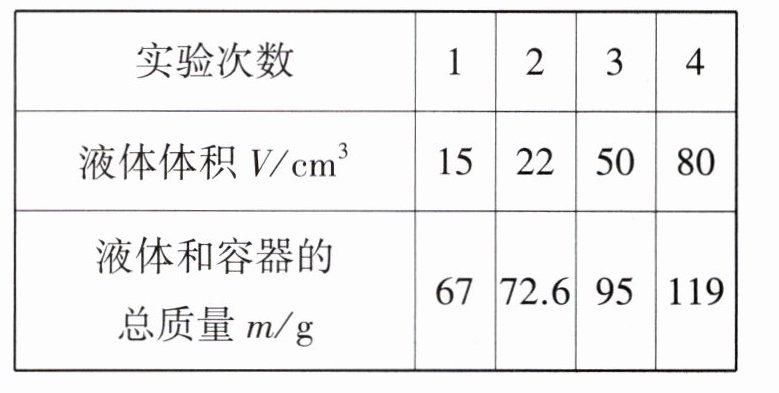 10. 小明同学在测定液体密度的实验中,没有把容器的质量测出来,而是多次测出容器和液体的总质量,并记录在下表中。根据表中的数据求得液体的密度是______$g/cm^{3}$,容器的质量是______g。