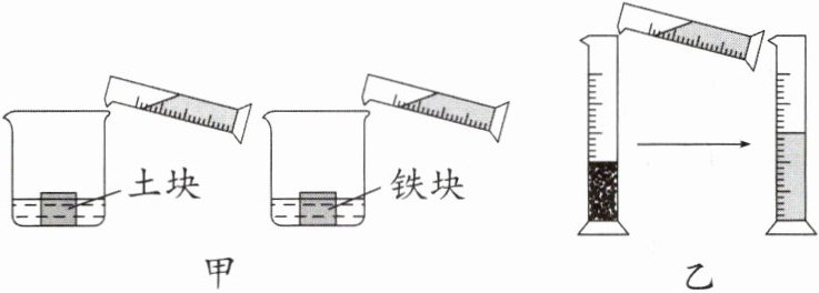 小兰:另取一块相同规格的铁块,将土块和铁块分别放入2只相同的烧杯中,用量筒量取一定体积的水,先沿烧杯壁缓慢地向烧杯内注水,如图甲所示。快要浸没土块或铁块时,?,直到水把土块和铁块刚好浸没。记录加入水的体积分别为$V_{1}$、$V_{2}$(单位:mL)。