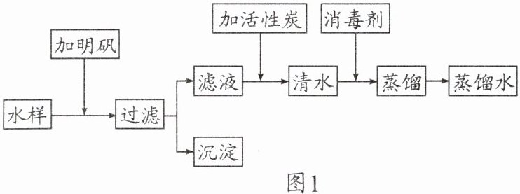 15. 小明同学去九仙山旅游时,用瓶装了一些山下的泉水,带回实验室,在老师的指导下,按如图 1 流程进行实验,制取蒸馏水。