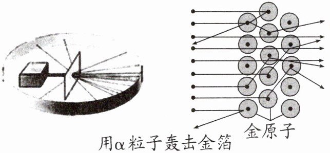 11. 探究原子结构的奥秘:1803 年英国科学家道尔顿提出了近代原子学说,他认为一切物质是由原子构成的,这些原子是微小的不可分割的实心球。1911 年,英国科学家卢瑟福用一束平行高速运动的α粒子(α粒子是带两个单位正电荷的氦原子)轰击金箔时(金原子的核电荷数为 79,相对原子质量为 197),发现大多数α粒子能穿透金箔,而且不改变原来的运动方向,但是也有一小部分α粒子改变了原来的运动路径,甚至有极少数的α粒子好像碰到了坚硬不可穿透的质点而被弹了回来(如图)。