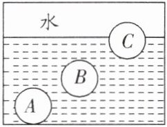 8. 当汤圆刚放入水中时会沉入锅底,而当汤圆煮熟时则会浮出水面,某同学用简化图模拟烧煮一段时间后汤圆分布图(其中 $ A $、$ B $、$ C $ 表示汤圆),则以下分析正确的是( )