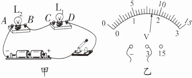 (1) 测量电源及灯泡两端电压。电压表接在 CD 两点,是为了测量灯泡____的电压,闭合开关,电压表的示数(如图乙所示)是____V。