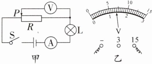 8. 如图甲所示,已知电源电压为$10V$,将滑动变阻器滑片P移到最左端,闭合开关S,灯泡发光,电流表示数为$0.35A$,电压表示数如图乙所示,则此时滑动变阻器接入电路的电阻是______$Ω$。当滑片P向右移动的过程中灯泡亮度______(填“变亮”“不变”或“变暗”)。