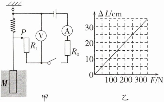 11. 如图甲所示是一种家庭水箱水位测量装置示意图,电源电压 $ 18 \, \text{V} $ 保持不变,电压表量程 $ 0 \sim 15 \, \text{V} $,电流表量程 $ 0 \sim 3 \, \text{A} $,$ R_0 $ 是阻值为 $ 10 \, \Omega $ 的定值电阻,$ R_1 $ 是长 $ 20 \, \text{cm} $、阻值为 $ 20 \, \Omega $ 的电阻丝,滑片 $ P $ 把电阻丝与轻质弹簧的指针连在一起。圆柱体 $ M $ 长 $ 80 \, \text{cm} $,底面积为 $ 200 \, \text{cm}^2 $。当水位处于最高处时,$ M $ 刚好浸没在水中,滑片 $ P $ 恰好在 $ R_1 $ 的最上端。轻质弹簧阻值不计,$ M $ 全部露出水面 前,弹簧的伸长长度 $ \Delta L $ 始终与受到的拉力 $ F $ 成正比,如图乙所示。